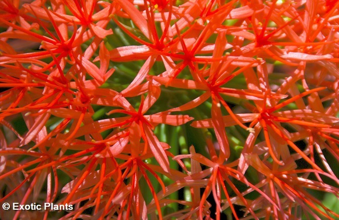 Scadoxus multiflorus, o flor de pincel, es una planta bulbosa llamativa que produce impresionantes racimos esféricos de pequeñas flores rojas, que se asemejan a un pincel. Sus vibrantes flores y su follaje tropical lo convierten en un punto focal en cualquier jardín. Prefiere sombra parcial y un suelo rico y bien drenado. Para un crecimiento óptimo, riega con regularidad durante la temporada de crecimiento. Se propaga separando los bulbos o a partir de semillas. Esta planta es adecuada para jardines sombreados y diseños de jardines tropicales, añadiendo un toque exótico y color. Se puede cultivar en macetas o directamente en el suelo.